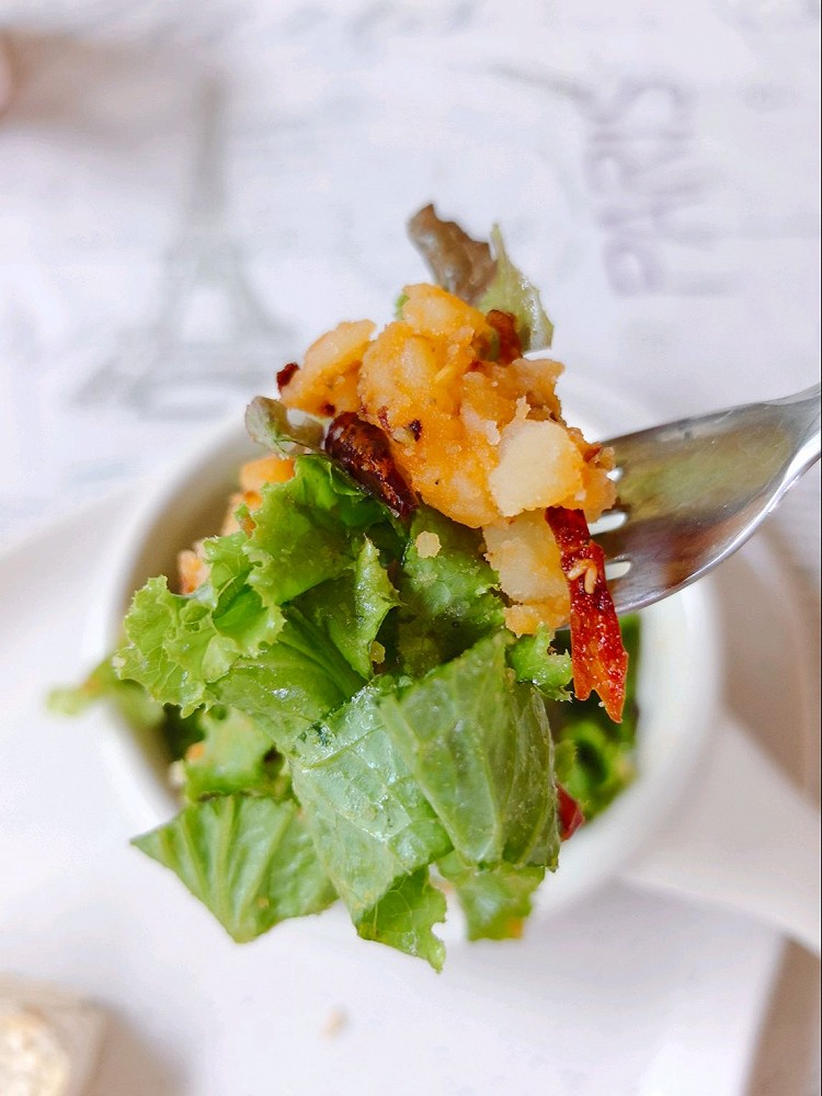 土豆🥔煮熟,压碎加入自己炒的麻辣鸡肉丝,加上生菜一拌,美味😍